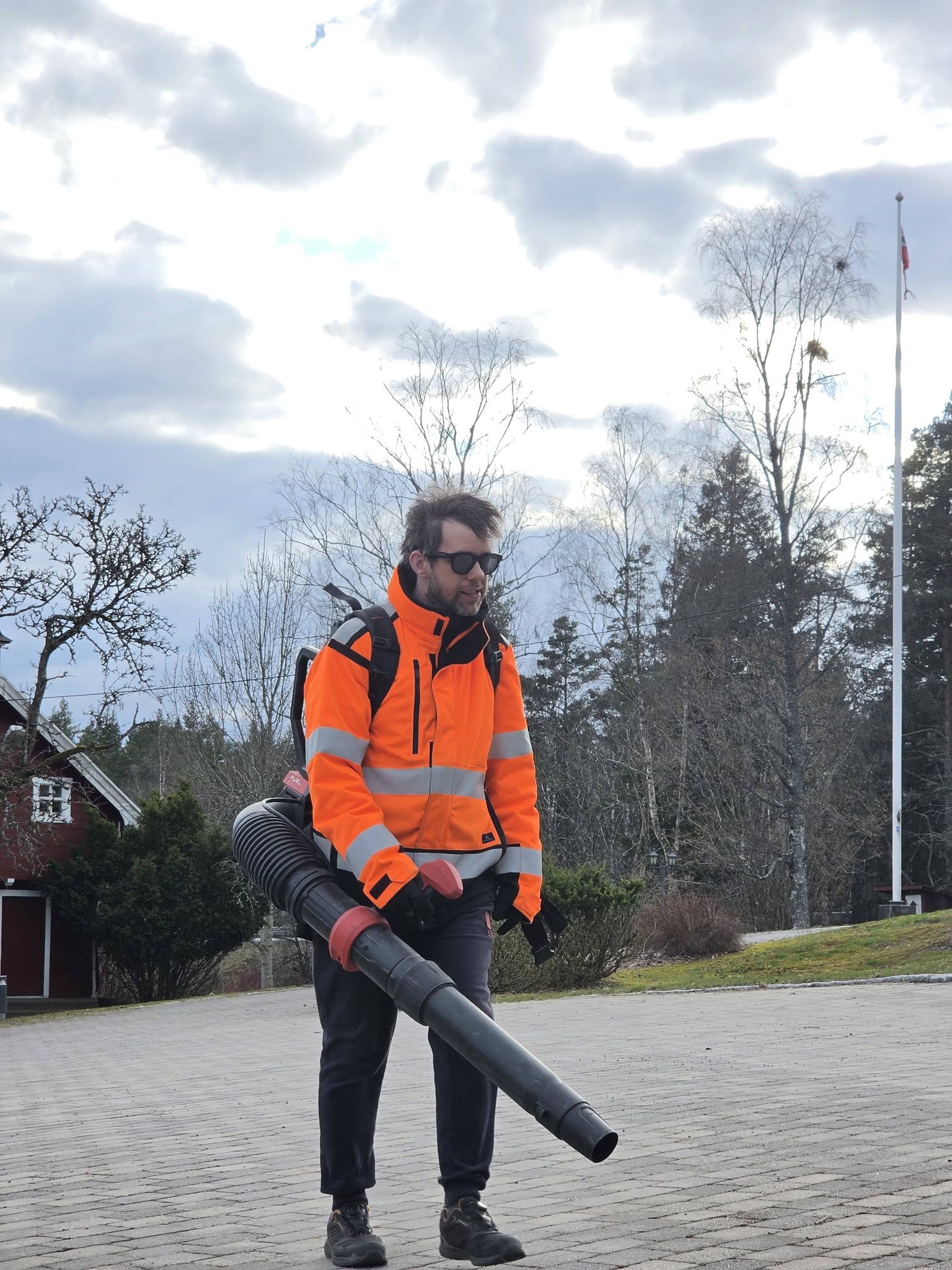 Her blåser jeg bort grus, løv og annet etter vinteren,